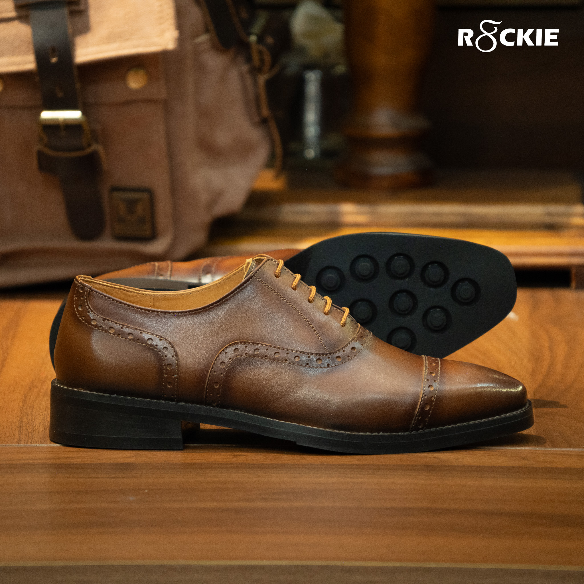Oxford đen/nâu patina: Lựa chọn cổ điển, an toàn cho môi trường công sở. Oxford Captoe đen của R8ckie kết hợp hoàn hảo với bộ suit màu xám, xanh navy, hoặc đen. Với dress code linh hoạt hơn, Oxford màu nâu là sự lựa chọn thông minh, dễ phối hợp với nhiều màu suit, sơ mi và phù hợp cả bốn mùa.